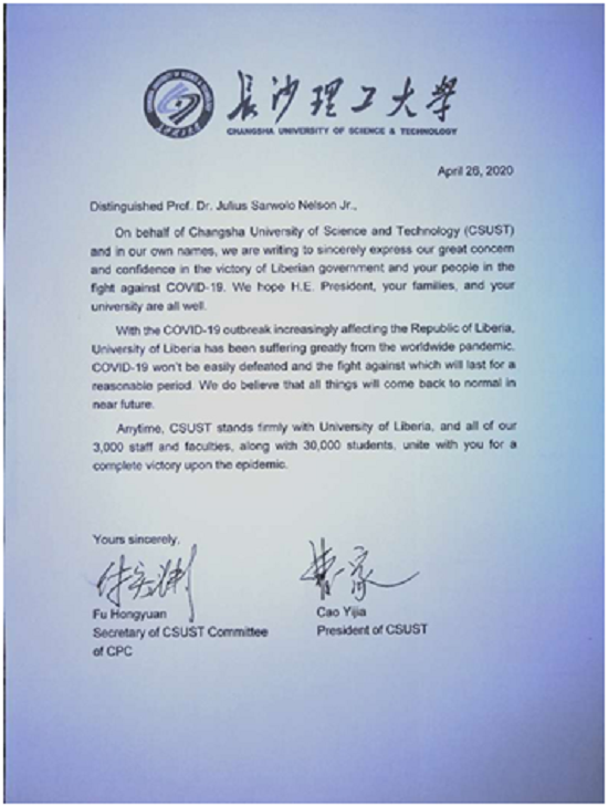 党委书记付宏渊、校长曹一家还通过慰问信向合作大学分别致以真诚的问候,表示“守望无远近”,全体师生包括驻外的孔子学院员工会坚定地同合作大学站在一起抗击新冠肺炎疫情,也相信当地政府会带领人民早日战胜疫情。利比里亚大学校长尼尔森感谢开云官网为利大抗击新冠疫情提供的重要支持,认为“患难时期见真情”,双方友好关系必将历久弥坚,表示愿同开云kaiyun体育加强合作,共同维护全体师生的生命健康安全。