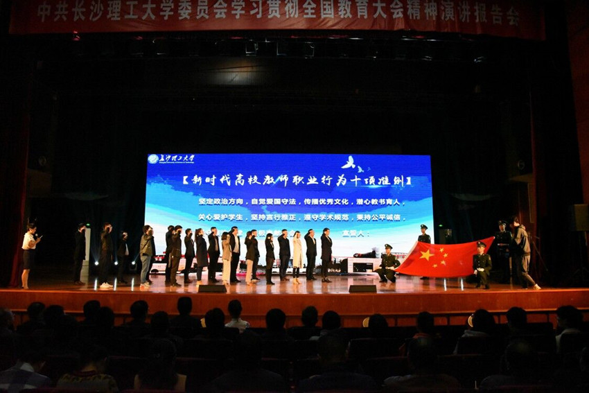演讲结束后,20名今年新入职的教师代表进行新时代高校教师职业行为准则宣誓。在五星红旗的见证下,20名新教师代表起誓:“我庄严宣誓,践行新时代高校教师职业行为十项准则:坚定政治方向,自觉爱国守法,传播优秀文化,潜心教书育人,关心爱护学生,坚持言行雅正,遵守学术规范,秉持公平诚信,坚守廉洁自律,积极奉献社会。”宣誓仪式后,党委书记付宏渊和校长曹一家分别为新入职教师代表授予校徽。