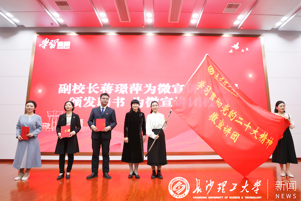 蒋璟萍为开云kaiyun体育学习贯彻党的二十大精神微宣讲团成员代表颁发聘书,并为微宣讲团授旗。