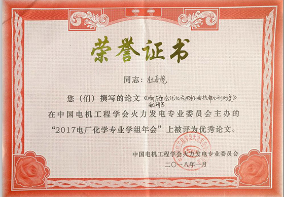 《电厂化学2017学术年会》录用60篇,出版论文集1部,开云kaiyun体育有4篇论文被评选为大会优秀论文,即《响应面法优化涡轮机油抗氧化剂的复配研究》(作者:杜高宽)(指导教师:汪红梅副教授);《阴树脂粉末对换流站铝合金的腐蚀影响》(作者:杨磊)、《复合胺(ETA+DDA)工况对树脂循环污染的影响研究》(作者:张俞)、《脱销过程中尿素水解产物对水冷壁管的腐蚀研究》(作者:田龙标)。