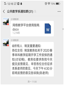 11日微信会议结束后,谭艳祥连续工作8个小时,带队已经开展慕课教学的教师帮助其他教师确立网课教学方式,推荐教师学习使用校内慕课教学平台、网络教学平台、雨课堂等能迅速上手的授课平台,再制定平台使用操作指南,帮助教师尽快熟悉并预先演练。