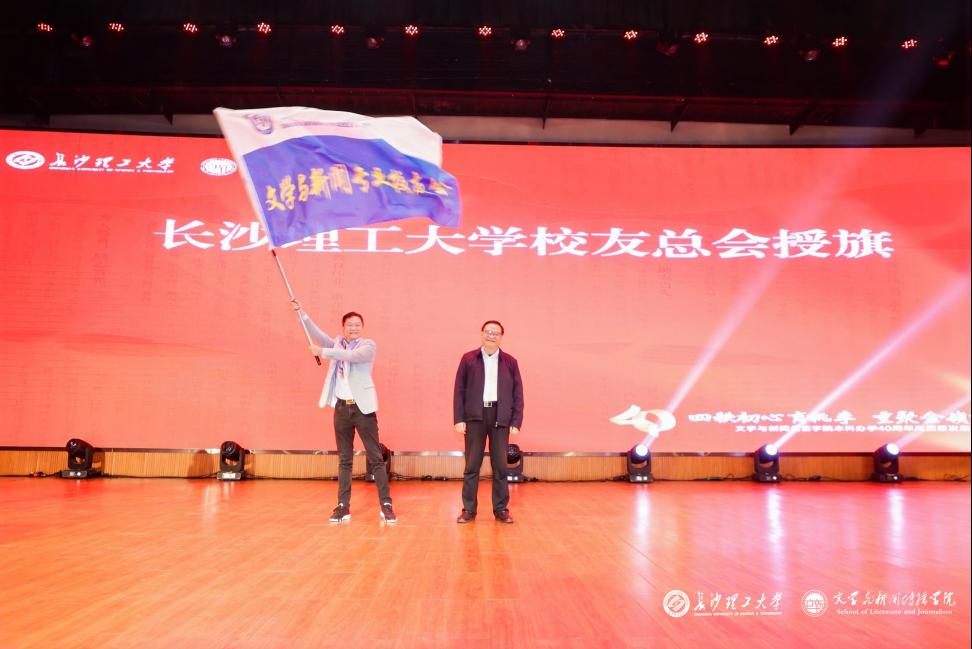 在学院本科办学四十周年高质量发展大会上,刘朝晖为文学与新闻专业校友会授旗。执行会长、汉语言文学专业87级校友刘原代表校友会接旗并发言,向母校致以最诚挚的感谢,并代表广大校友表示坚定支持学院的建设和发展。