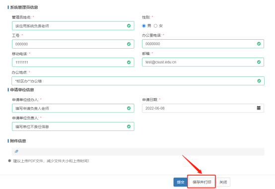 按照如下示例填写系统内申请表格,表格中带*标识框为必填项。填写申请信息,信息核对无误后点击“保存并打印”。