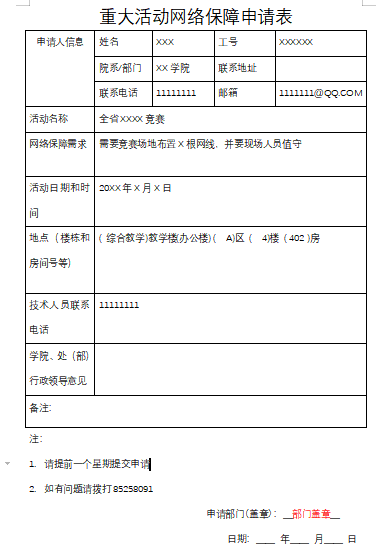6.服务规则:适用于校级临时重大活动的网络支持保障(如大型招聘会、核酸检测)或者各二级部门举办的面向全省(全国)的重大活动的网络支持保障。已列入校历的例行重大活动无需按此流程办理,临时需要特别网络服务、支持的除外。为确保服务质量,请主办方至少提前一个星期进行申请。