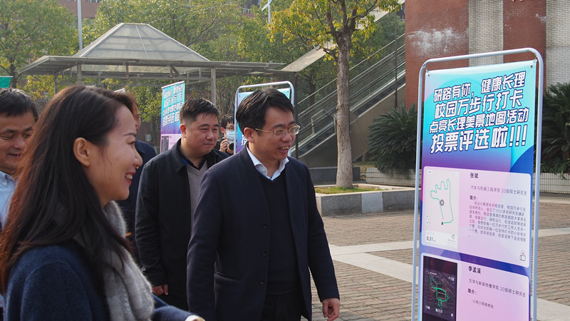 副校长钱国平在闭幕颁奖仪式上致辞。钱国平充分肯定了“研路有你,健康长理”校园万步行打卡活动成效,表示本次活动充分展现了研究生对于健康绿色出行方式的倡导和参与文体活动的热情,展示了研究生对建设文明校园的决心和活动锻炼的实践创新能力。他勉励全体研究生共同努力让校园环境“美起来”、让运动氛围“浓起来”、让校园安全“强起来”,打响长理绿色攻坚战,让“绿色”担当不止于科研。随后,与会领导为获得者颁奖并参观研究生们展示的创意路线。