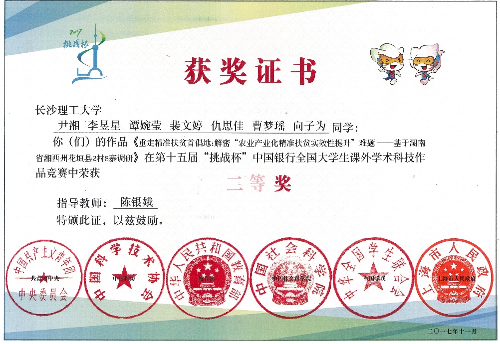 尹湘本科毕业于开云kaiyun体育金融学专业,自2015年起在导师指导下连续5年围绕“农村普惠金融发展与精准扶贫问题”进行暑期三下乡社会实践及理论研究。调研报告《重走精准扶贫首倡地:解密“农业产业化精准扶贫实效性提升”难题——基于湖南省湘西州花垣县2村8寨实地调研》于2017年获湖南省“挑战杯”大学生课外学术科技作品竞赛特等奖、第十五届“挑战杯”全国大学生课外学术科技作品竞赛获全国哲学社科类二等奖。因成绩优异,尹湘同学于2018年推免本校研究生继续深造。