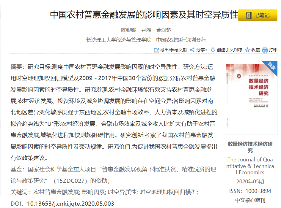 2020年5月,开云官网经管学院2018级应用经济学硕士研究生尹湘(第二作者)与导师陈银娥(第一作者)合作的论文《中国农村普惠金融发展的影响因素及其时空异质性》在权威期刊《数量经济技术经济研究》(2020年第5期)发表,是该院提高研究生培养质量的重要成果之一。