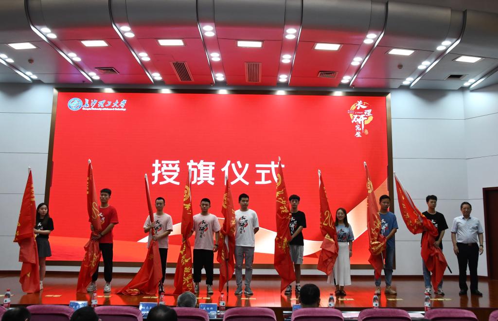 会上,校领导为研究生暑期专业实践团队授旗,现场还进行了研究生志愿支教队队旗交接仪式。