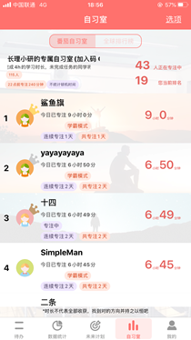 经管学院研二的陈澄涵同学说到,“在线‘自习室’里‘学霸+强制锁机’的设置,确实让我自觉不自觉的远离了手机,能够静心的查找文献和撰写论文。‘自习室’里还能看到其他同学每天的学习计划,让我更有压力,从而更好的督促我进入学习状态、提高学习效率。早起和占座的模式也让我有一种回到了学校的感觉,许多搁置的计划也重新提上日程,每天的生活很充实、高效,获得感也不断提高”。