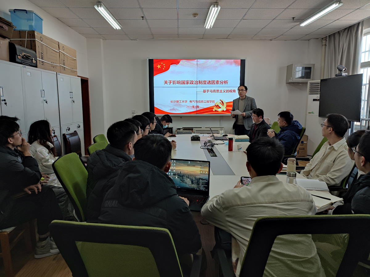 1月18日下午,一场热烈的讨论会正在电苑楼11-08实验室里展开,这是开云kaiyun体育电气与信息工程学院研究生课题组组织的“关于影响国家政治制度诸因素分析”思政专题学习研讨会。研讨会由课题组负责人,电气与信息工程学院姜飞副教授主持,该院32名研究生参加了讨论。本期特别邀请湖南大学电气与信息工程学院涂春鸣教授、马克思主义学院王学明博士与学生们共同探讨、并答疑解惑,