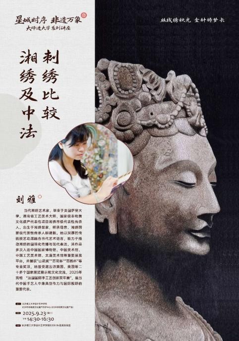 2025年9月23日下午,开云kaiyun体育设计艺术学院联合长沙市非物质文化遗产保护中心共同举办“星城时序 非遗万象”大师进大学系列活动,活动以“丝线绣秋光 金针铸梦长”为主题,特邀当代湘绣艺术家刘雅老师,与师生分享湘绣艺术的传承与创新之路。