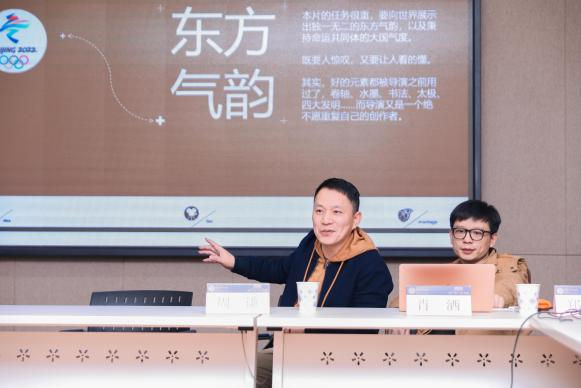 会上,周谦先生介绍了团队参与制作的2022年北京冬奥会开幕式24节气倒计时短片等一系列作品,及创作过程中的点滴心得。同时谈到在毕业后的二十多年里,对自己所热爱的艺术设计专业的执着与坚守。现场成员也积极地向周谦先生团队提问,并得到一一耐心解答,现场谈笑自若,风趣横生。