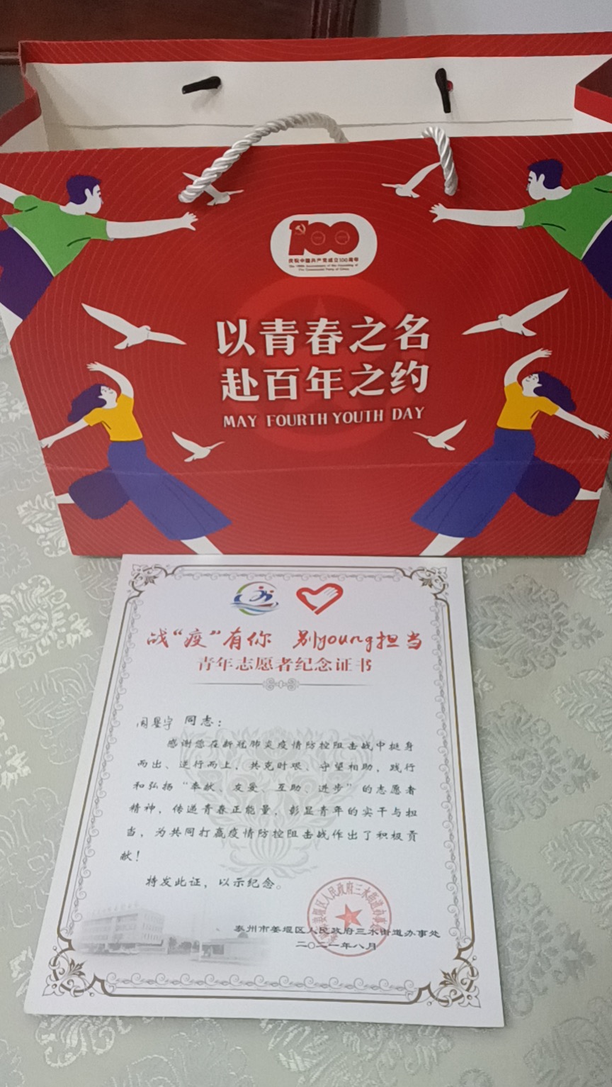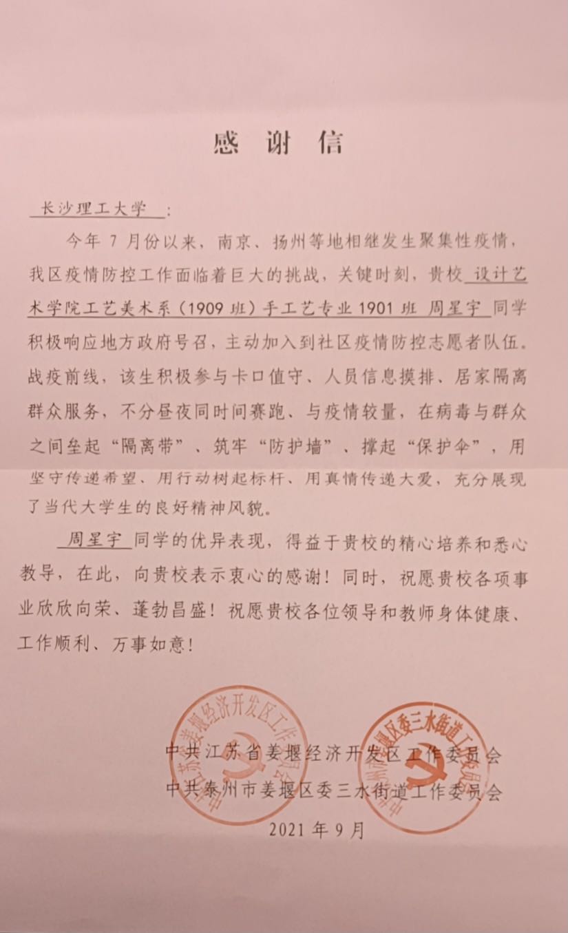 “今年7月份以来,南京、扬州等地相继发生聚集性疫情,我区疫情防控工作面临着巨大的挑战,关键时刻,贵校设计艺术学院工艺美术系(1909班)手工艺专业1901班周星宇同学积极响应地方政府号召,主动加入到社区疫情防控志愿者队伍。战疫前线,该生积极参与卡口值守、人员信息摸排、居家隔离群众服务,不分昼夜同时间赛跑、与疫情较量,在病毒与群中之间垒起‘隔离带’、筑牢‘防护墙’、撑起‘保护伞’,用坚守传递希望、用行动树起标杆、用真情传递大爱,充分展现了当代大学生的良好精神风貌。”9月7日,开云kaiyun体育收到了这封由中共江苏省姜堰经济开发区工作委员会、中共泰州市姜堰区委三水街道工作委员会发来的感谢信。