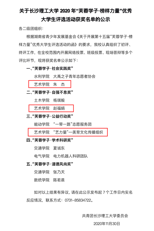 本次评选活动旨在挖掘、宣传长理大学生积极进取、拼搏奋进的感人事迹和先进典型,在大学生中树立自立自强的榜样,激励广大青年学生向身边榜样学习。经过网络、班级投票、线下答辩等多个评比环节,最终评出五类奖项名单。其中,设计艺术学院2020级工艺美术研究生朱杰荣获“芙蓉学子·社会实践奖”、2020级艺术设计研究生赵福娟荣获“芙蓉学子·自强不息奖”以及由李慧老师指导的钟慧玲学生团队项目《“美育潇湘”—艺传河小青护河理念志愿服务项目》荣获“芙蓉学子·公益行动奖”。