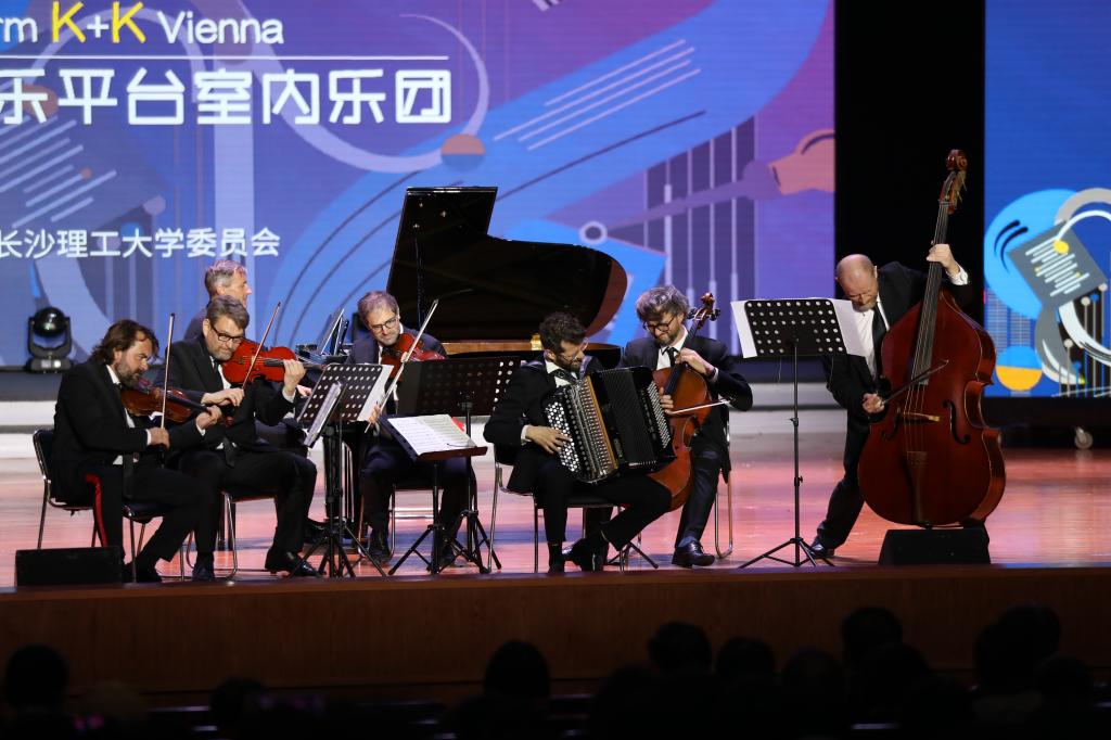 4月23日,我院承办的高雅艺术进校园维也纳音乐平台室内乐团(Platform K+K Vienna)音乐会在学校云塘校区大会堂成功举行。校党委书记付宏渊与全校师生一千六百余人共同欣赏此次音乐会。