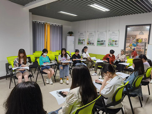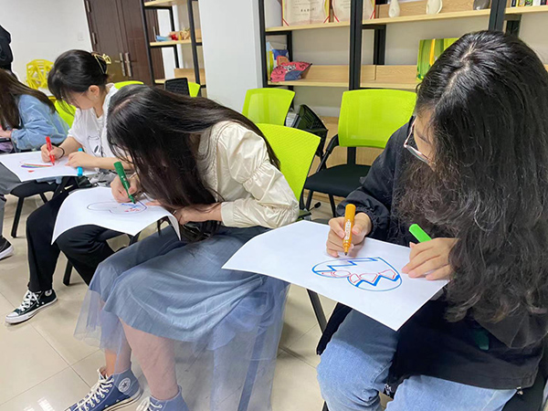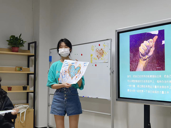 活动开始,在阿尔法脑波音乐的旋律中,同学们闭上眼睛进行冥想,同学们回想了最近的好情绪及坏情绪。接着,同学们在白纸上画出一颗爱心,并用色彩、面积等不同表达形式填充爱心,反应其所冥想的情绪。结束后,同学们仔细观察自己所画内容并讨论发言了自己近期的不好情绪背后的压力来源。在主持人的引导下,用击鼓传花的方式让同学们讲出自己处理负面压力和情绪的方式。最后,设计艺术学院心理辅导员秦子玲老师结合了“情绪ABC理论”对如何处理负面情绪进行了总结。