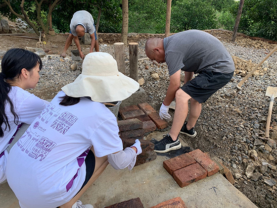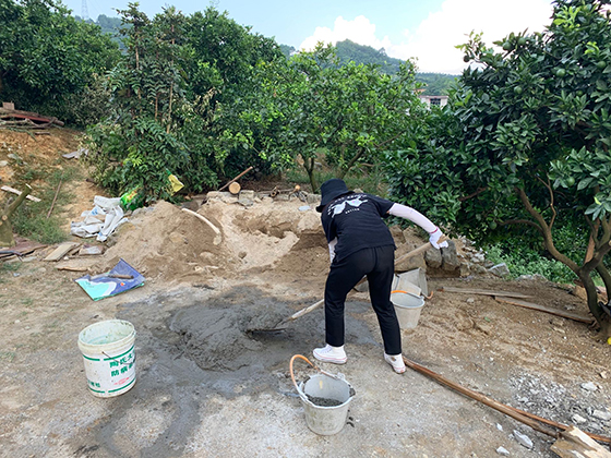 施工庭院的增加,实践团队成员仍以热情饱满的态度积极参与庭院改造过程中去。烈日当空,捋起袖子,拿起工具,搬砖、贴瓦,团队成员虽然汗流浃背,但依旧为村民庭院建设努力贡献一份力量。