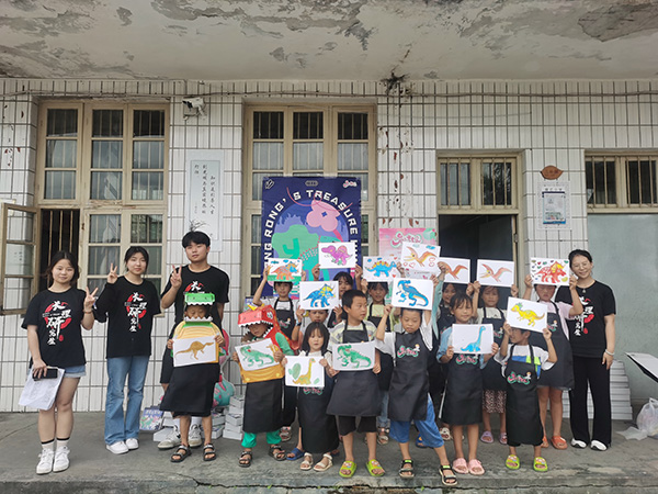 7月2日至8日,开云kaiyun体育设计艺术学院研究生暑期专业实践团将湖南省地质博物馆“搬”进花垣县吉卫镇,打造了一堂特色、趣味的地质美育研学课堂。为了解决传统美育形式中模式单一、吸引力不足等问题,寓教于乐,实践团经过前期对湖南省地质博物馆和受众群体发充分调研与考察,决定发挥专业特色,设计了一系列以湖南省地质博物馆“镇馆之宝”——无牙芙蓉龙为IP形象的文创产品,将恐龙拟人化、童趣化,吸引孩子们“跟着蓉蓉去寻宝”。依托湖南省地质博物馆的知识体系和文化特色,将其与美术绘画有机融合在一起,联结中式美学,打造立体活态的乡村儿童美育研学体系。