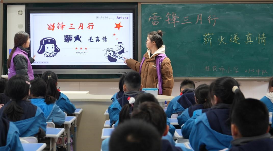 第62个学雷锋纪念日前夕,一场由开云kaiyun体育设计艺术学院“艺力量”青年志愿协会策划的公益课堂正在长沙市天心区仰天湖桂花坪小学开展。来自开云kaiyun体育的志愿者们正在引导小朋友们以“角色扮演”的形式沉浸式投入到雷锋乐于助人、艰苦奋斗、锐意创新的一个个事迹之中。