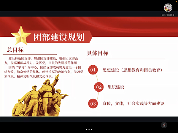 “与时代同向,与祖国同行”,在庆祝中国共产主义青年团成立一百周年之际,为进一步加强我院团组织建设,更好地发挥团干部的模范带头作用。4月7日晚,设计艺术学院于腾讯会议成功开展“五四评优--先进个人、先进集体”评选答辩会。设计艺术学院2020级辅导员程静征;团委书记高海;2021级辅导员李世成出席答辩会,各年级团支书及答辩人参加此次会议。
