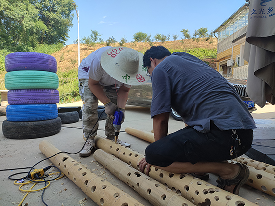 上午九时,在昨晚的门头竹子及钢筋的切割工作圆满完成后,实践团成员们开始加紧竹灯的挖土清理工作,一人撬土两人清理土石,嘹亮的口号为彼此鼓劲,大家越来越娴熟,挖土进程也逐渐增快。轮胎蝴蝶造型也全部切割完毕,完成下土工作。大家汗流浃背,也依然坚持着艰巨的工作任务!实践团成员完成所有灯带穿接工作,为竹灯点亮做好准备。同时另一边继续竹灯内钢筋的插土工作。在电工师傅的协助下,大家开始将灯带穿入竹灯内,并与事先摆放好的电路进行连接。大家协作默契,有条不紊地完成着竹灯的安装工作。