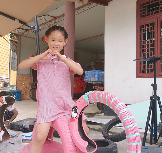 轮胎组完成美化工作并涂上清漆保证轮胎的整洁性,孩子们也迫不及待地在小象背上欢乐玩耍。随着挖土机的到达,另一组则配合挖土机进行定点挖土工作。大家配合默契,气氛和谐。稍作休整,成员们继续今天的工作任务。一队将已做好的轮胎装置埋入土中,做好一切安全保护措施,为未来儿童游戏创造更舒适的环境。另一组开始锯取门头装置所需竹子。暴雨过后,大家的工作热情依旧,高效完成本日工作!