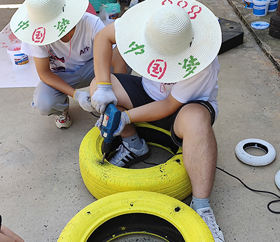 实践团成员们头顶“中国梦”草帽继续上阵工作。两队人员分工明确,一队在已有轮胎造型上增添图案花纹,使其整体效果更加丰富有层次。另一队则继续完成竹子穿孔的工作。几百根竹子的打孔任务极为繁重,同时需要力量与技巧的支持,男生们挑起大梁,用自己的肩膀扛起任务的半边天!