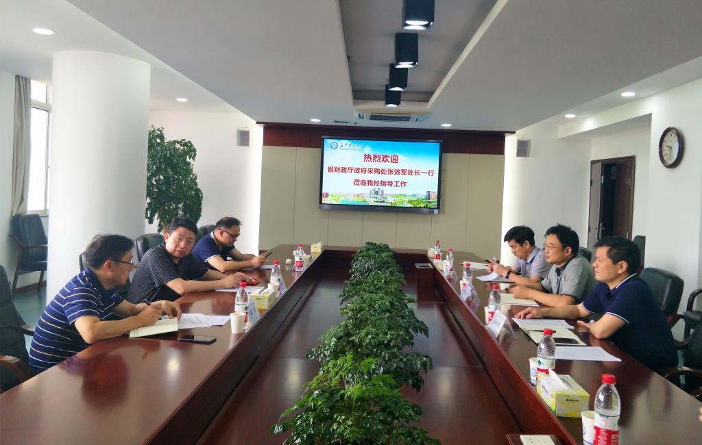 7月11日上午,省财政厅政府采购处处长张效军一行三人来开云官网对政府采购工作情况进行调研,校党委副书记邹宏如,国有资产管理处处长庄创奇、副处长周娇林及采购管理科相关同志参加现场调研和座谈。