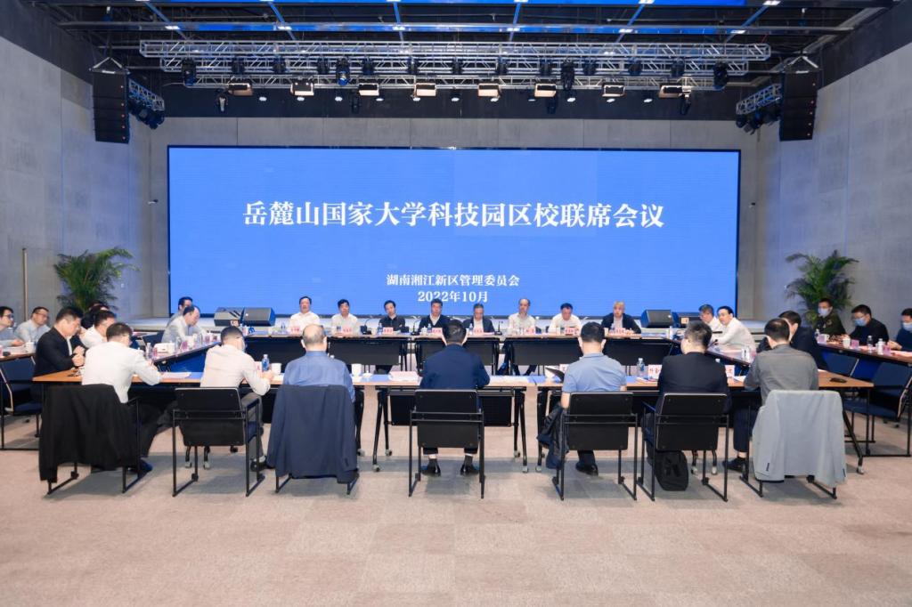 为加强区校合作,推进教育和科技深度融通,更好地服务于国家高水平科技自立自强、地方经济社会发展和产业创新。10月18日,湖南湘江新区管理委员会在岳麓山大学科技城岳麓科创港1楼路演室召开岳麓山国家大学科技园区校联席会议。湖南湘江新区(长沙高新区)党工委副书记、管委会主任,岳麓区委副书记、区长何朝晖出席并讲话,湖南湘江新区相关部门主要负责人参加;我校副校长曾祥君出席会议并讲话;出席会议的还有国防科技大学、中南大学、湖南大学、湖南师范大学、湘潭大学、湖南农业大学、开云kaiyun体育、中南林业科技大学、 湖南工业大学、湖南中医药大学、湖南工商大学、长沙学院、 湖南工程学院等高校校领导。会议由湖南湘江新区(长沙高新区)党工委委员、管委会副主任郭力夫主持会。