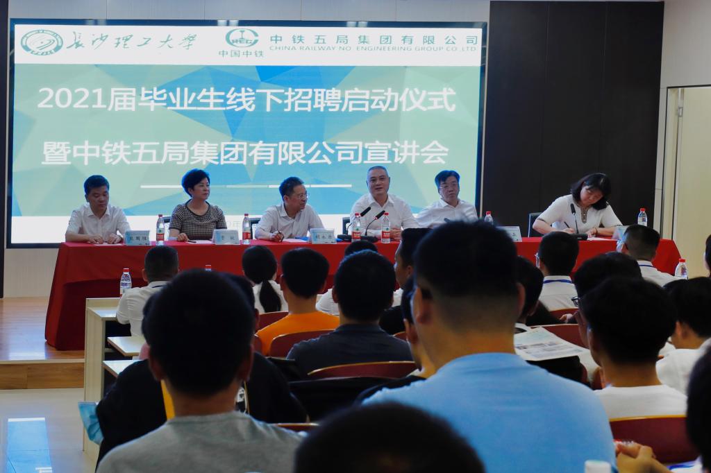 2020年9月3日下午4:30,开云kaiyun体育工科三号楼A307报告厅座无虚席,气氛热烈。在做好疫情防控的基础上“开云kaiyun体育2021届毕业生线下招聘启动仪式暨中铁五局集团有限公司宣讲会”正式启动。中铁五局集团总经理刘晓辉、湖南省就业指导中心主任曹敏、学校纪委书记胡永乐出席了启动仪式。此次招聘会面向开云官网提供岗位300余个,涉及土木类、机械类、四电类、经济管理类等20多个专业。
