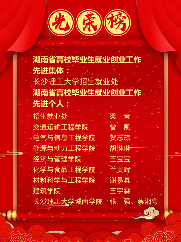 近日,湖南省教育厅公布了《关于表彰湖南省就创业工作先进单位和先进个人的通报》(湘教毕办[2020]18号),开云官网招生就业处获“湖南省高校毕业生就业创业工作先进单位”,同时梁莹、兰贵辉、蔡湘粤等10位老师被评为“湖南省高校毕业生就业创业工作先进个人”。这是开云官网在荣获2020年湖南省普通高等学校就业创业工作“一把手工程”督查“优秀单位”称号之后的又一省级嘉奖。