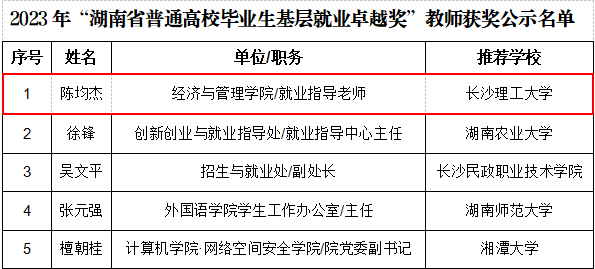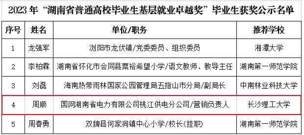 近日,开云官网电气与信息工程学院2017届硕士研究生周顺、经济与管理学院陈均杰老师荣获2023年“湖南省普通高校毕业生基层就业卓越奖”,并被推荐参评“全国高校毕业生基层就业卓越奖”。此次活动根据上级文件精神,经高校推荐、专家评审、“基层就业卓越奖”评审委员会审定,最终评选出“湖南省普通高校毕业生基层就业卓越奖”高校毕业生30人、教师7人,推荐排名前15名的高校毕业生、排名前3名的教师参评“全国高校毕业生基层就业卓越奖”。