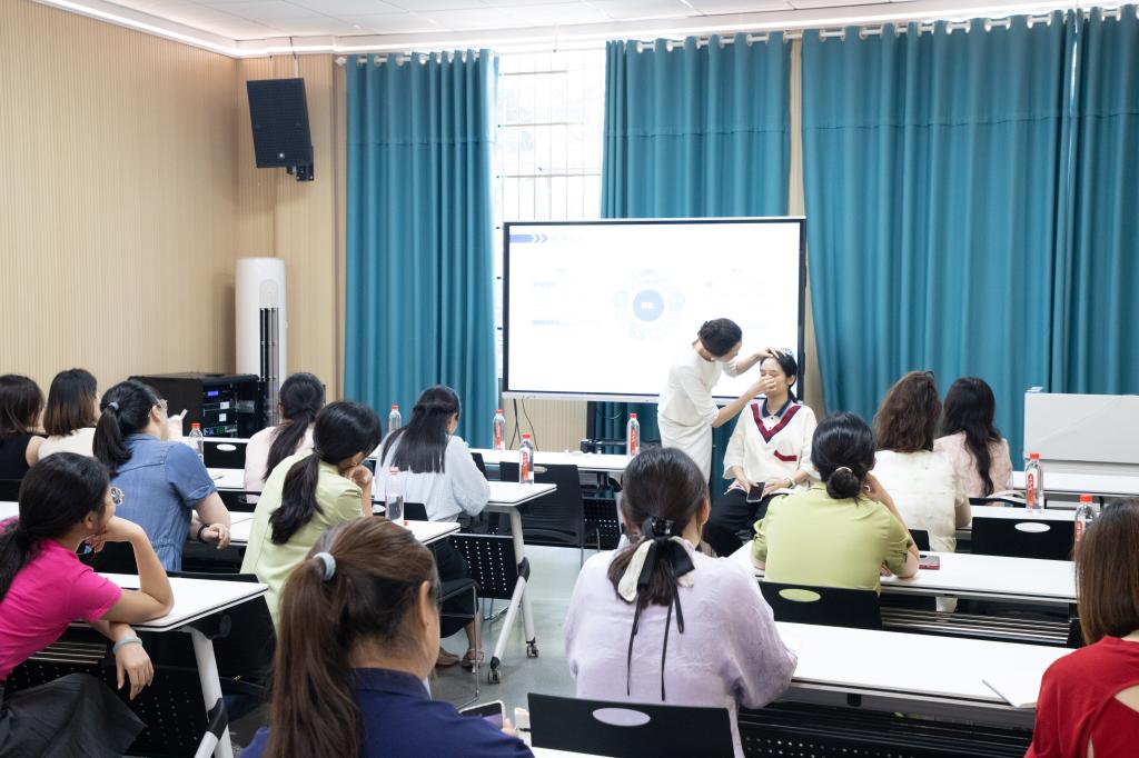 在职业形象塑造环节,李晴老师不仅详细解析了仪容整洁的标准、服饰搭配的要领、言谈举止的规范,更现场邀请老师模特演示职业妆容的画法技巧;职业仪态培训部分,重点讲解了站姿、坐姿、走姿等肢体语言,并通过互动练习强化了眼神交流等非语言沟通技巧;社交礼仪实践环节,李晴老师与在场教师即兴演绎商务接待场景,生动展示了引领、介绍、握手等礼仪规范;面试技巧模块,系统介绍了STAR行为面试法则、面试全流程管理及沟通效应等实用技巧。
